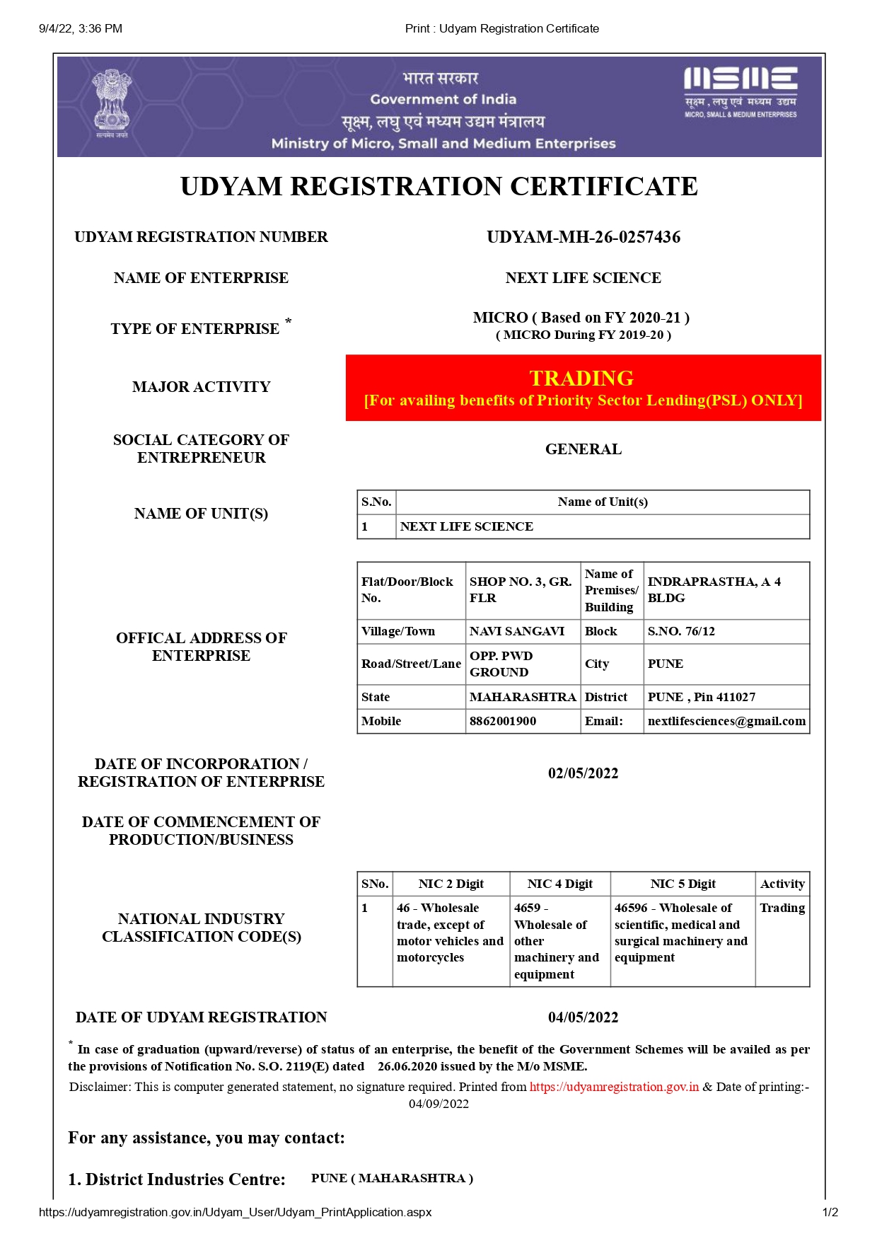 Udyam Registration Certificate